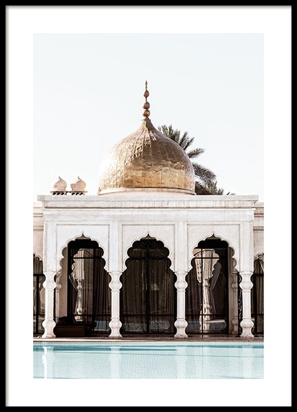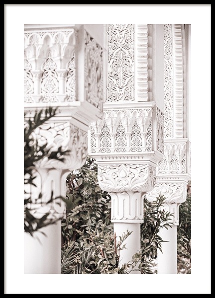 Handpicked Foto van een witte, ovalen boog met gebeitelde details en een zwarte deur. De betoverende details zorgen dat we versteld staan van de architectuur van Marrakech en alle geschiedenis die het uitademt. Deze poster is onderdeel van Studio Amara, een fotocollectie gemaakt door Desenio Design Studio in Marrakech.