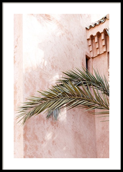Handpicked Foto van een schaduw op een roze gebouw met grote palmbladeren aan de linkerzijde. Met felle en kleurrijke posters doet je huis in slechts enkele seconden gloednieuw aan! Deze poster is onderdeel van Studio Amara, een fotocollectie gemaakt door Desenio Design Studio in Marrakech.