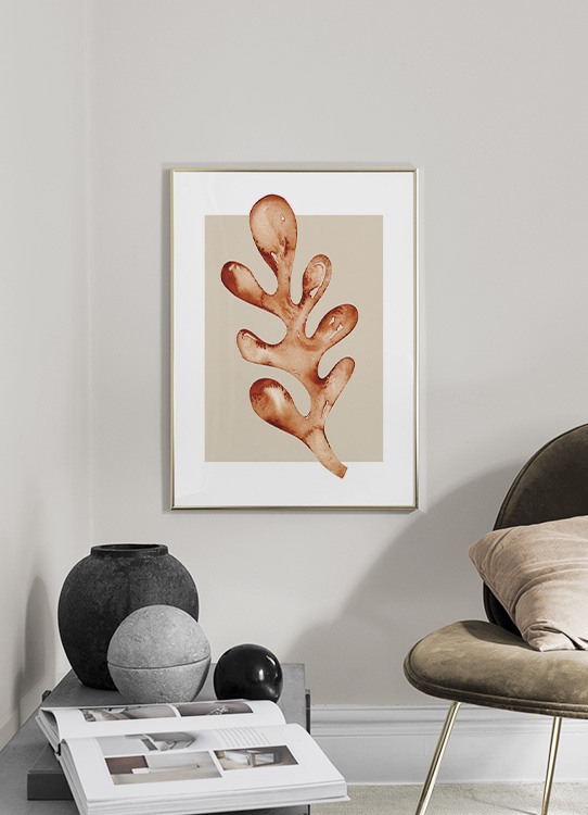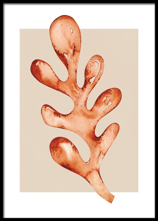 Handpicked Een aquarel van een hazelkleurig koraal tegen een beige achtergrond. Met warme en levendige kleuren aan je muren wordt de kamer een gezellige ruimte vol moderne invloeden.