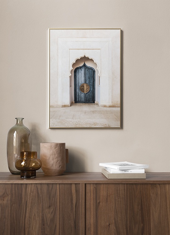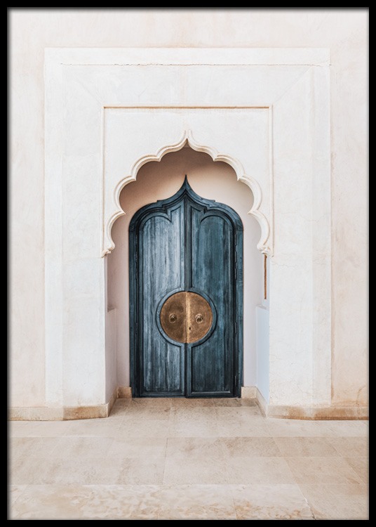 Foto van een blauwe deur met gouden grepen, en een gewelfde boog met golvende afwerking ervoor. De architectuur in Marrakech, die met veel oog voor detail is gemaakt, is bekend bij velen, en wij zijn voortdurend onder de indruk door de schoonheid ervan! Deze poster is onderdeel van Studio Amara, een fotocollectie gefotografeerd door Desenio Design Studio in Marrakech.
