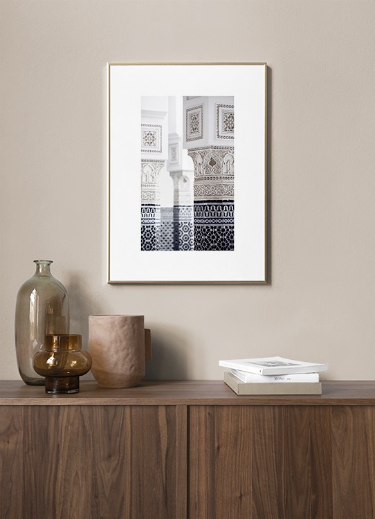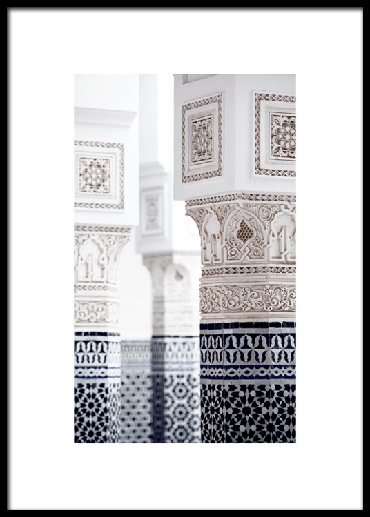 Handpicked Close-upfoto van pilaren met blauwe en witte patronen. Fotokunst uit Marrakech, met mooie pasteltinten en prachtige patronen, zorgt dat je huis gloednieuw aandoet! Deze poster is onderdeel van Studio Amara, een fotocollectie gemaakt door Desenio Design Studio in Marrakech.