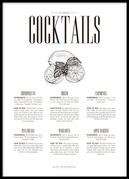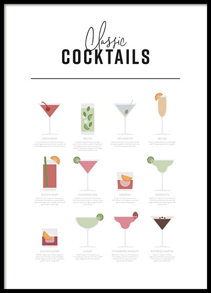 Cocktails maken met vrienden is een leuke activiteit en zorgt zonder twijfel voor plezier. Als de voorkeur geeft aan wijn boven cocktails, hebben we ook posters voor je, zowel posters met witte wijn als met rode wijn in verschillende stijlen. We hebben kleurrijke cocktailrecepten met zowel de klassieke ouderwetse als een moderne Mojito. Mix wat cocktails met je beste vrienden, of schenk een glaasje wijn in - proost!