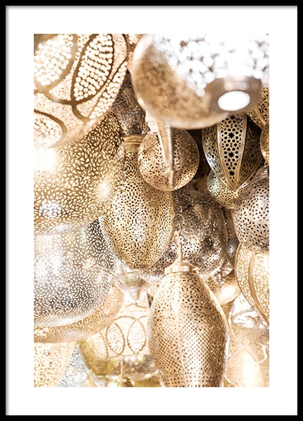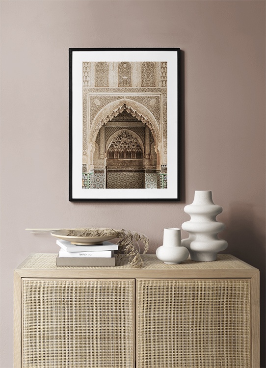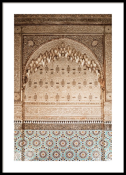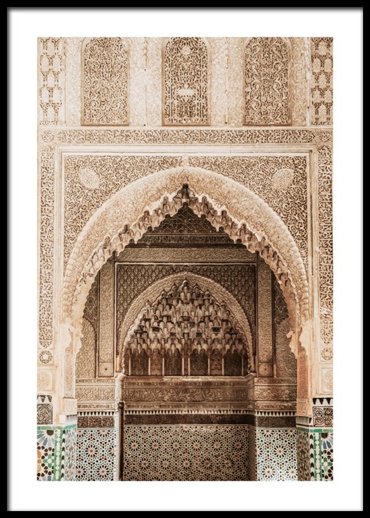 Handpicked Foto van een gouden, gewelfde boog met uitgebeitelde details in een tempel. Deze plek, die vol details is en gemaakt met veel artisticiteit, is echt magisch. Deze poster is onderdeel van Studio Amara, een fotocollectie gemaakt door Desenio Design Studio in Marrakech.
