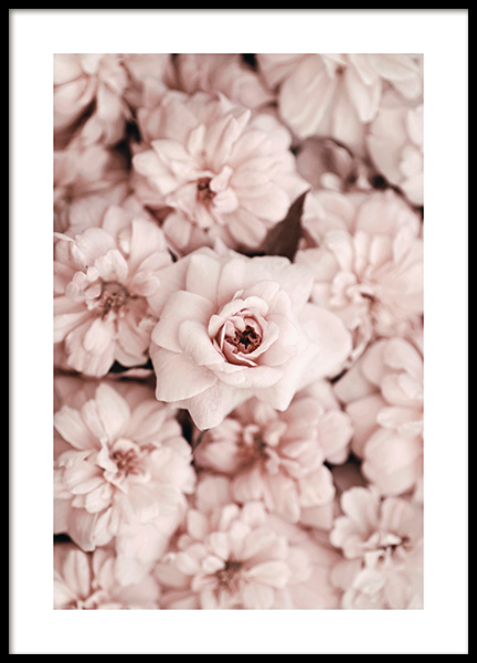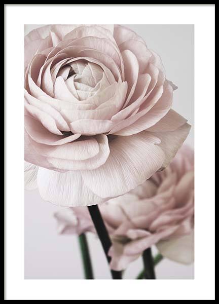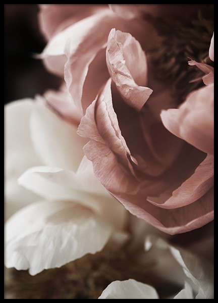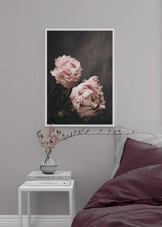 Foto van twee grote, roze pioenen tegen een donkergrijze achtergrond. Botanische afbeeldingen en posters zijn een geweldige aanvulling voor het huis waar je een warme en gastvrije omgeving wilt creëren. Een aantal botanische invloeden in huis halen brengt nieuw leven en een mindful gevoel, en de roze tinten zorgen voor een zachte indruk.