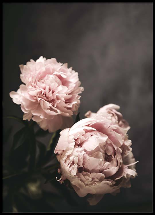 Vanaf € 9,10Foto van twee grote roze pioenen tegen een donkergrijze achtergrond