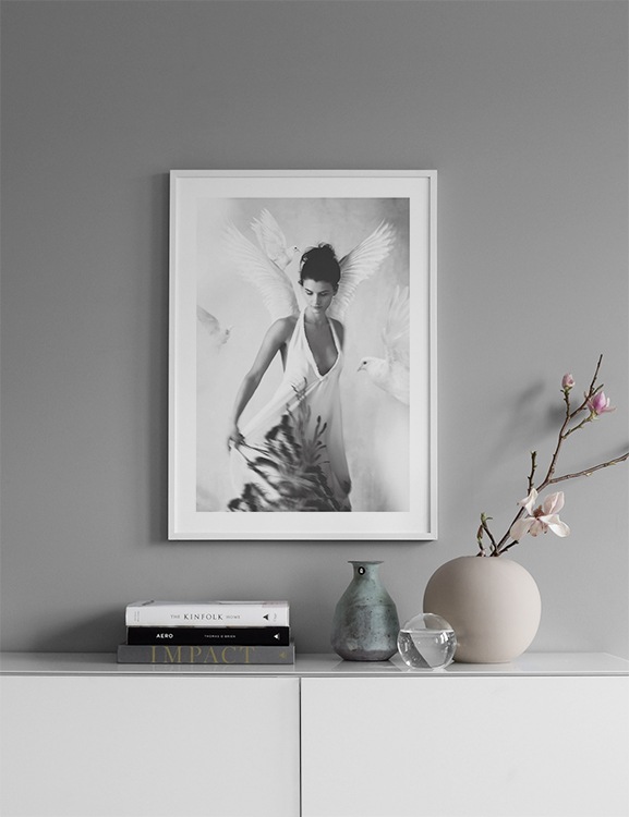 Handpicked Fotoposter Halo uit de serie Essence van Tove Frank is een van onze zorgvuldig geselecteerde motieven. Poster Halo is een mooie zwart-witfoto, waarop een vrouw met witte engelenvleugels staat afgebeeld. De witte duiven die de vrouw op de foto omringen, drukken vrede en liefde uit en creëren de stemming die synoniem is geworden aan Toves kunst. Poster Halo van Tove Frank heeft een ingebouwde passe-partout die het motief mooi inkadert.