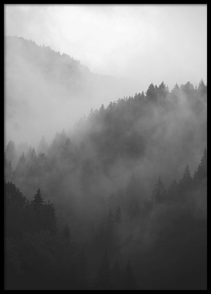 Handpicked Zwart-witfoto van een bos dat in de mist ligt. De donkere sparren en de zachte nevel vormen mooie grijstinten die gemakkelijk te combineren zijn met andere motieven.