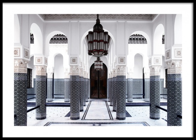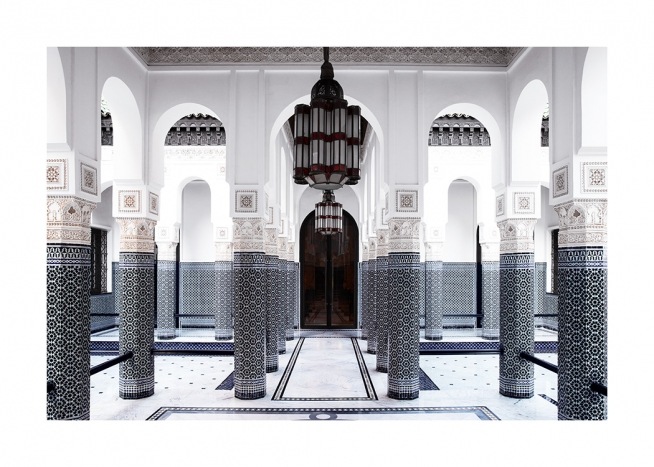 Handpicked Foto van blauwe en witte pilaren in een ruimte met een zwarte deur en een lamp aan het plafond. Als je een fan bent van historische architectuur en mysterieuze hoekjes, dan hebben we hier iets voor jou! Deze poster is onderdeel van Studio Amara, een fotocollectie gemaakt door Desenio Design Studio in Marrakech.