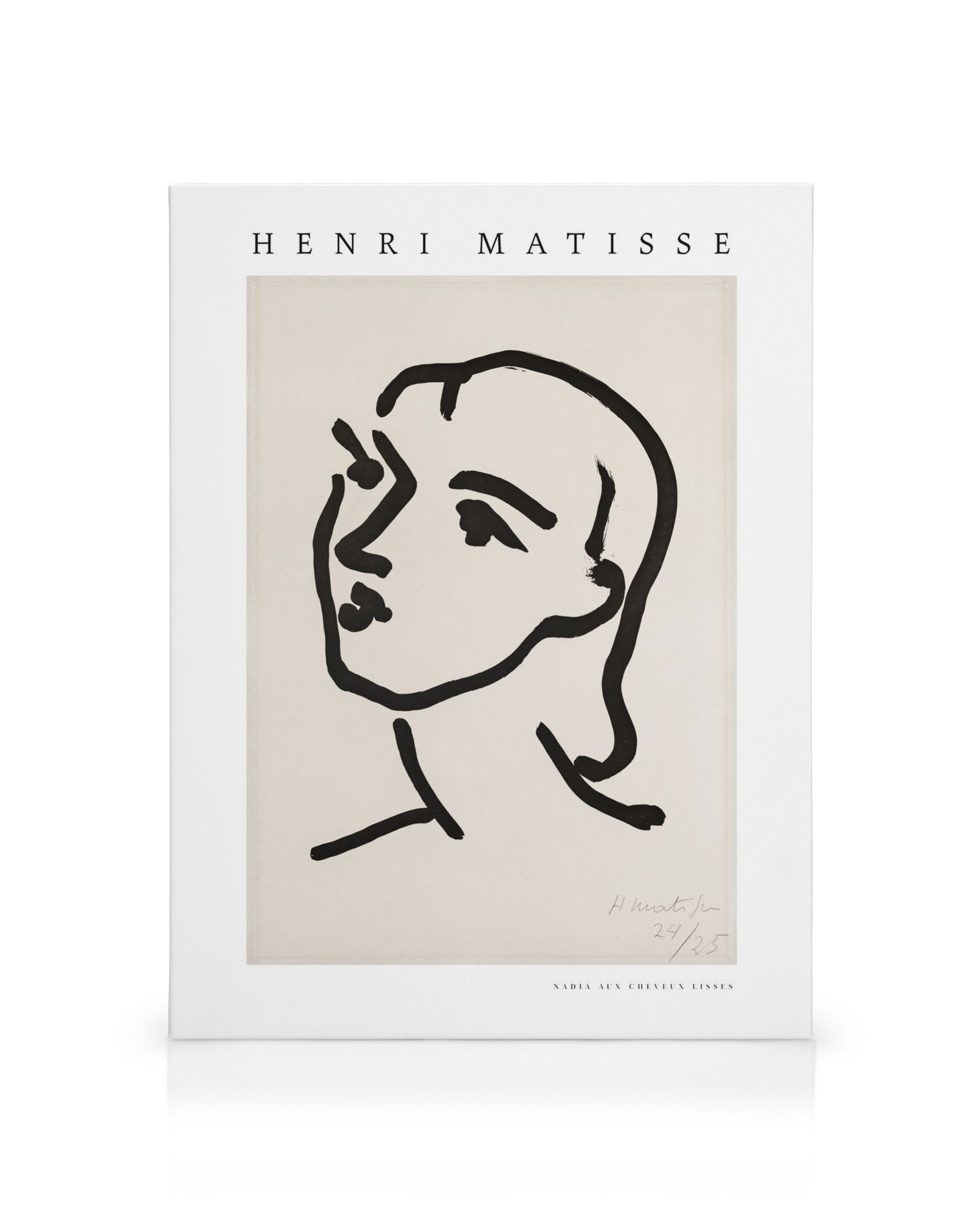 Een minimalistische canvas met een zwart-wit lijntekening van een gezicht, met de tekst "HENRI MATISSE" erboven.