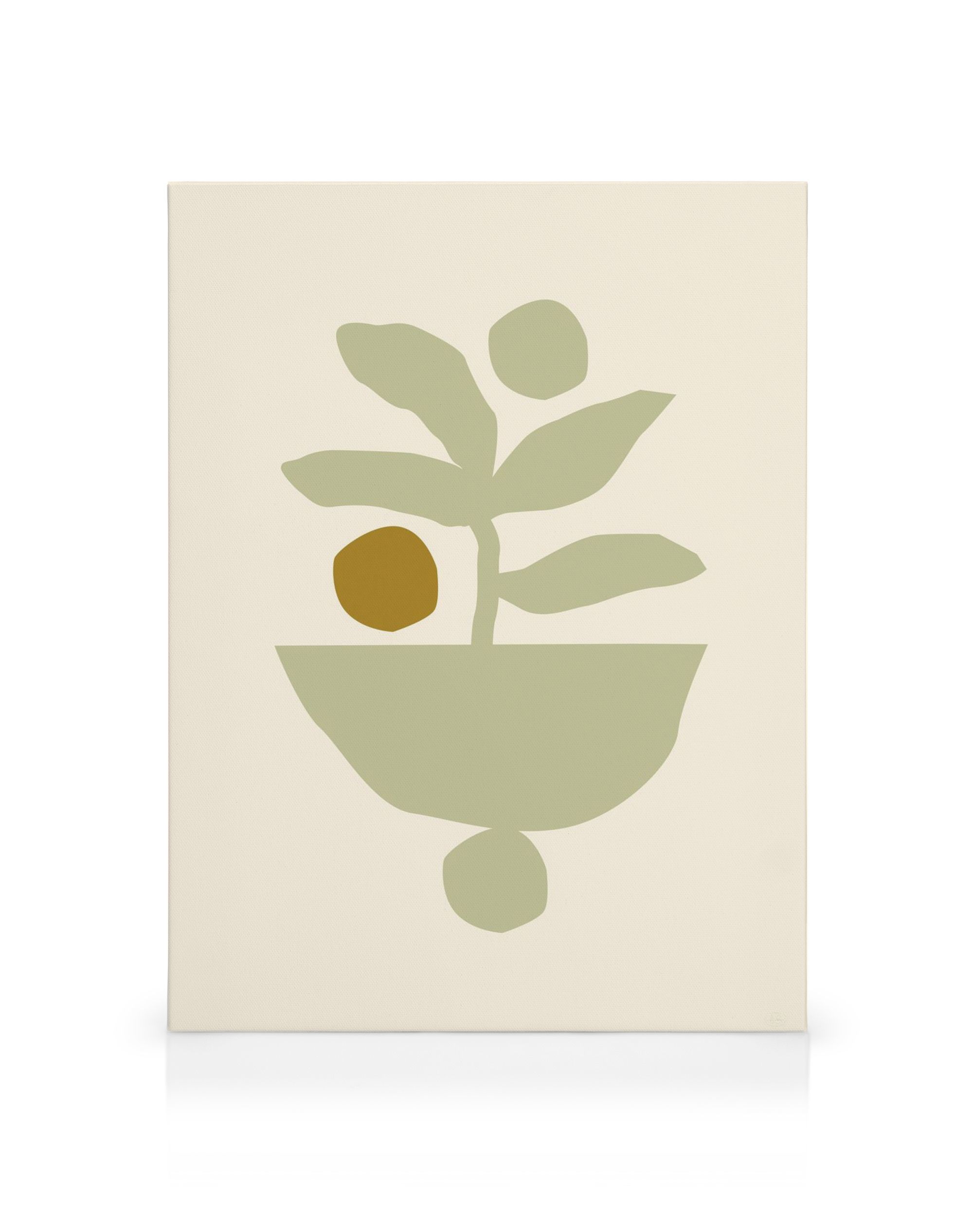 Vanaf € 24,95Eenvoudige en stijlvolle canvas van een plant met platte groene bladeren in een groene pot, tegen een licht beige achtergrond. Een prachtig botanisch muurkunststuk voor je fotowand.