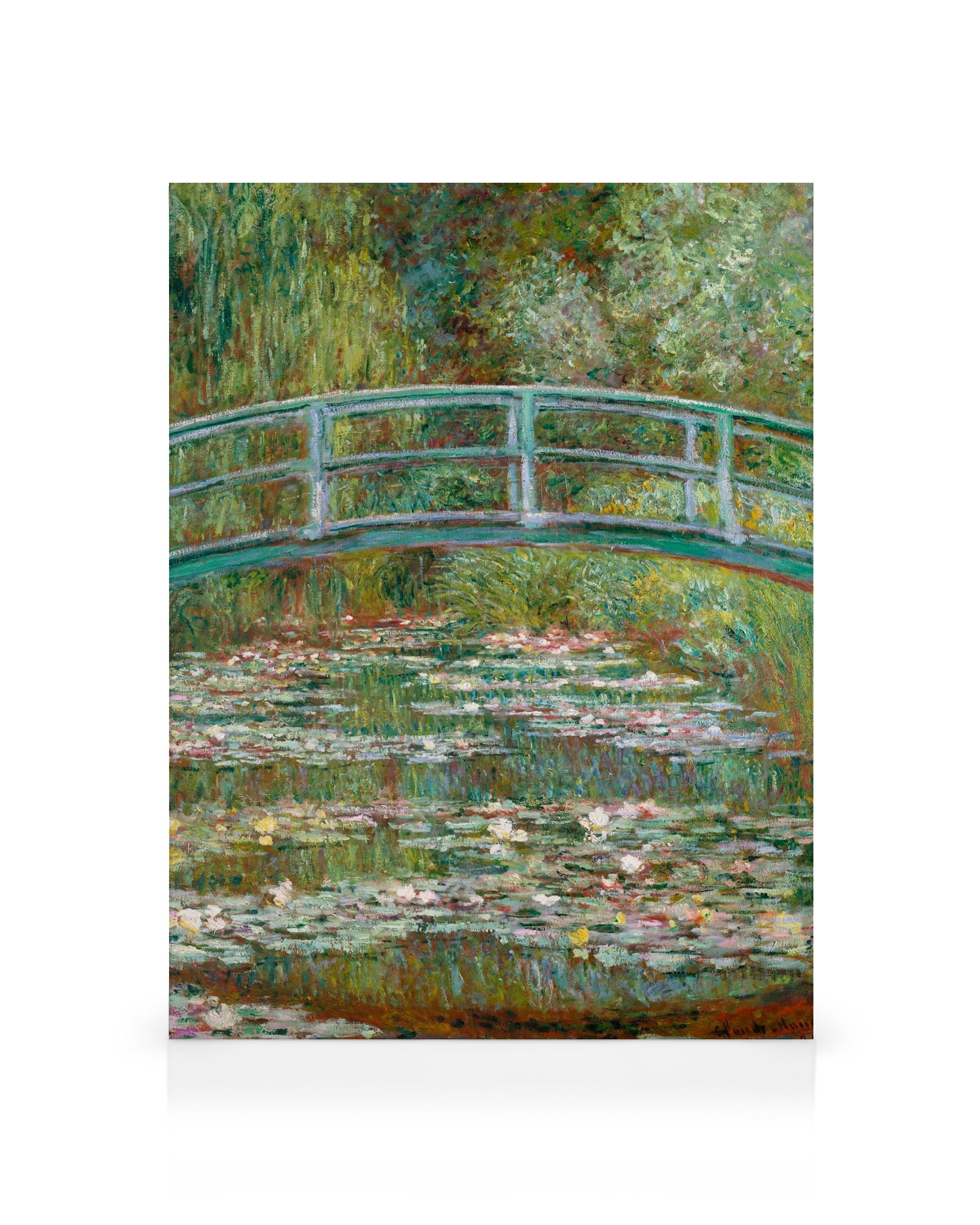 Vanaf € 9,10Een prachtige canvas met een groene brug over water met waterlelies in een impressionistische stijl. Levendige penseelstreken in groen, blauw, roze en wit creëren een scène met bomen en struiken op de achtergrond.