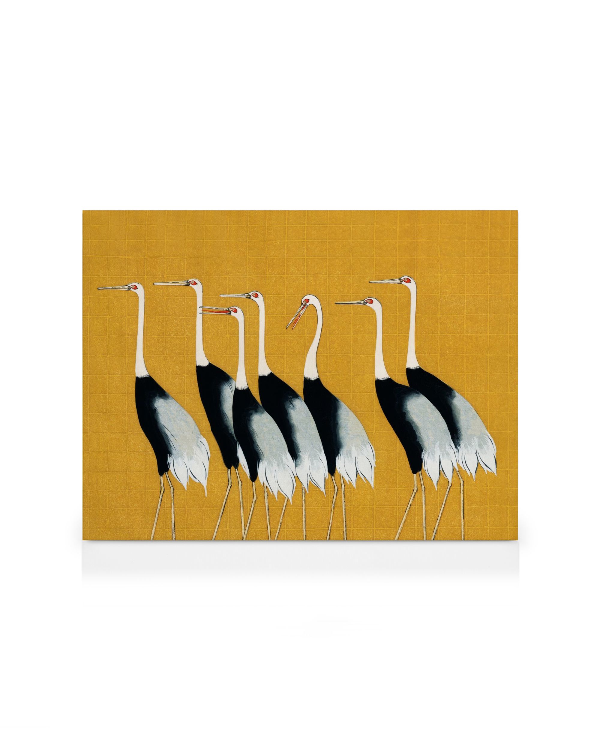 Vanaf € 8,45Canvas met een illustratie van vijf vogels met lange nekken en poten, opgesteld tegen een gele achtergrond met een raster. De vogels zijn wit en zwart met rode details rond de ogen.