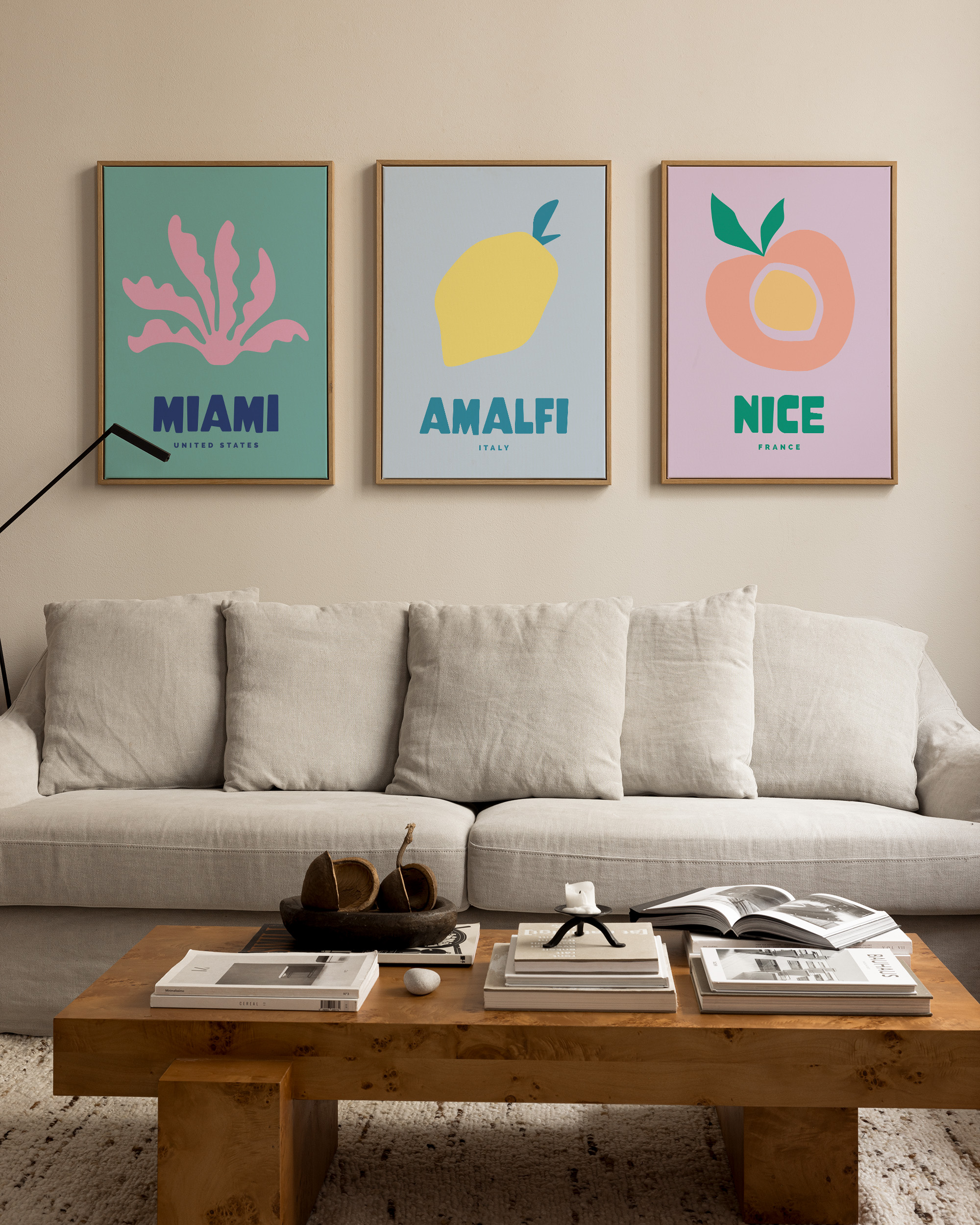 Vanaf € 24,95Drie canvassen met reisbestemmingen: Miami met koraal, Amalfi met citroen en Nice met perzik. Perfecte wanddecoratieset op canvas.
