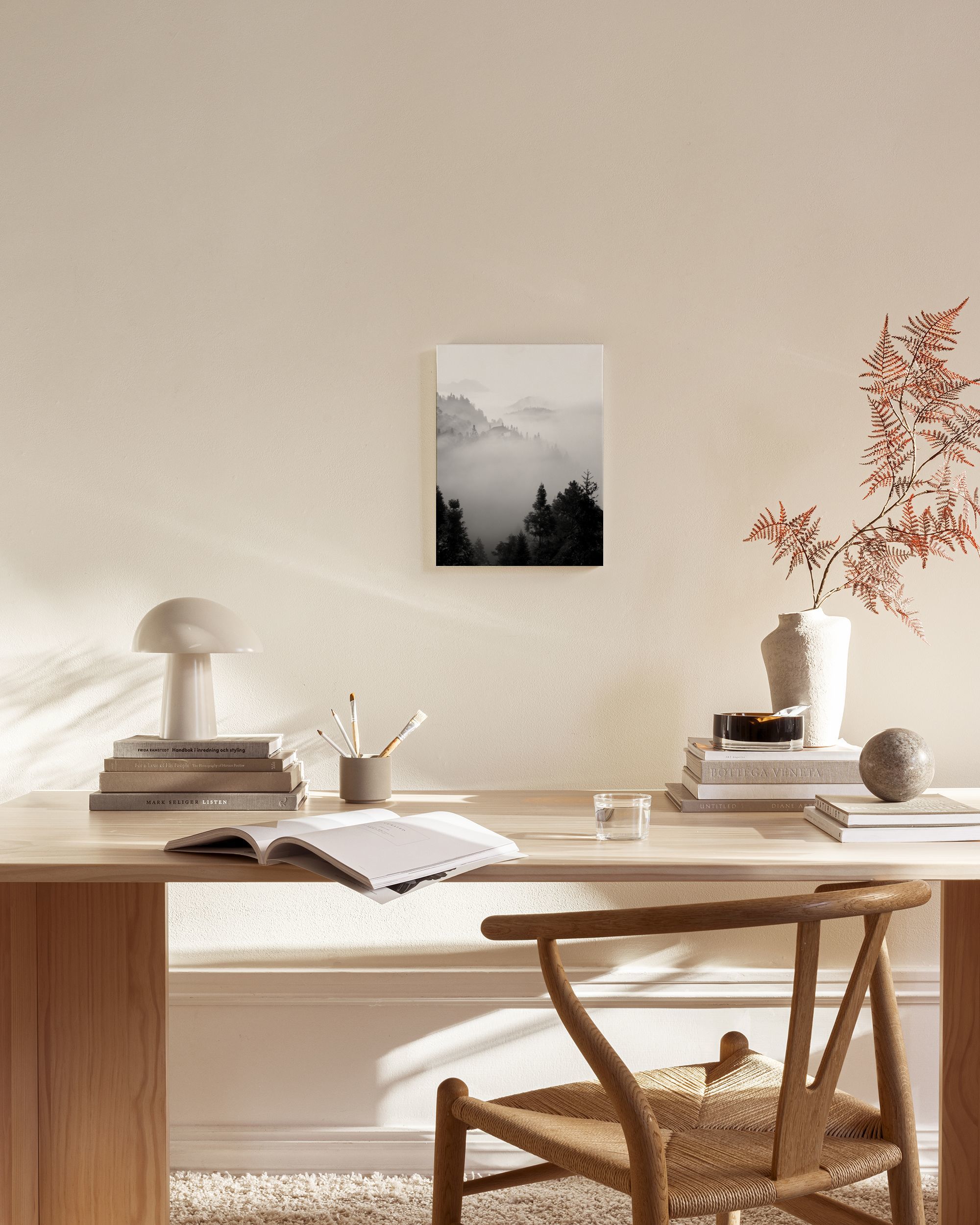 Vanaf € 5,98Een zwart-wit foto op canvas van mistige bergen, met donkere bomen op de voorgrond en lagen met mist bedekte heuvels daarachter. Een prachtig stuk muurkunst voor jouw huis.