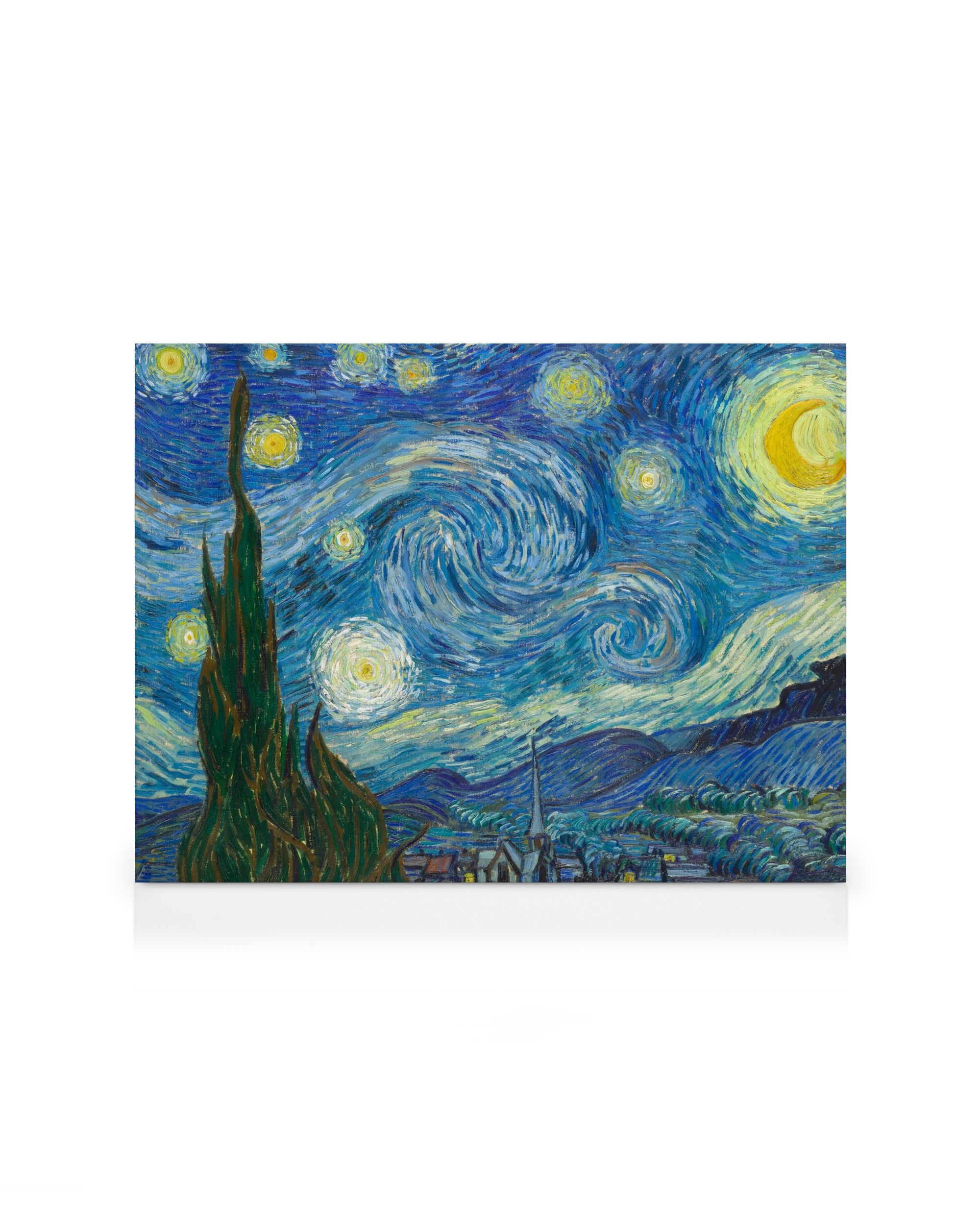 Vanaf € 24,95Adembenemend canvas van een schilderij geïnspireerd door Vincent van Gogh, met een kolkende blauwe lucht met sterren en maan. Inclusief een cipres en een klein dorpje met blauwe en witte huizen. Perfecte muurkunst voor jouw thuis gallerie.