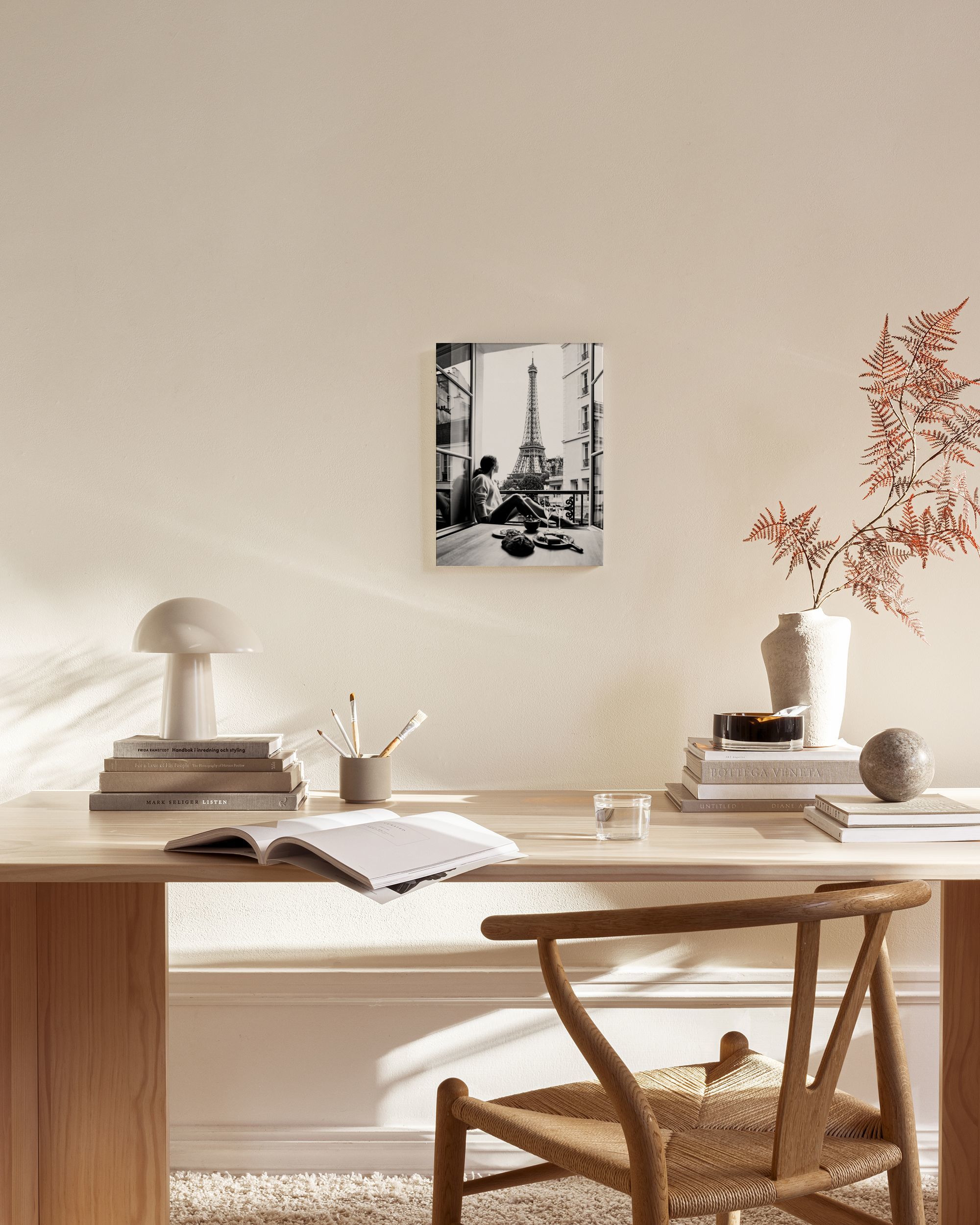 Vanaf € 24,95Een zwart-wit canvas met daarop een persoon die bij een open raam zit en naar de Eiffeltoren kijkt. Een charmante scène voor elk huis of foto wand.