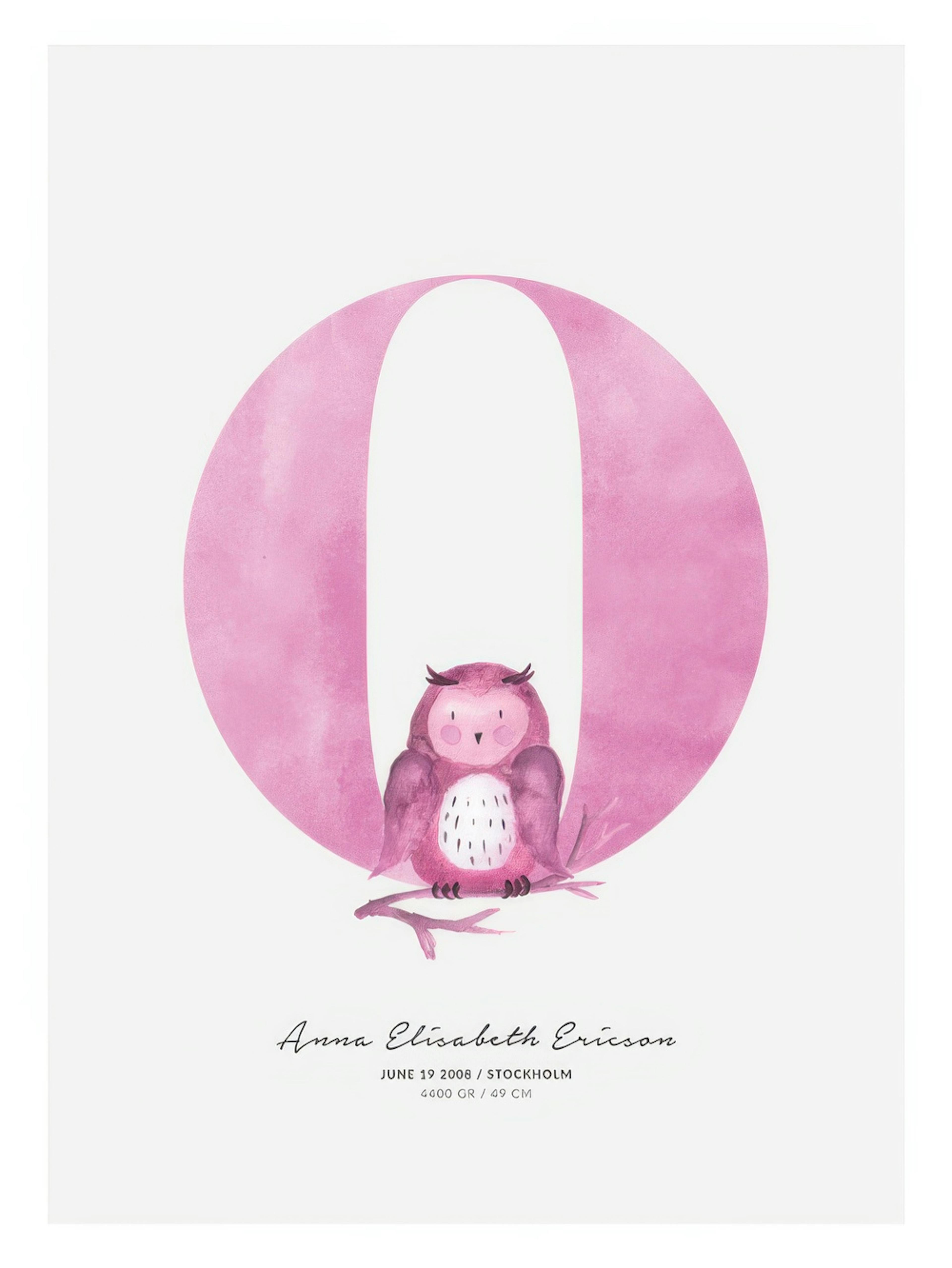 Vanaf € 7,80Maak een persoonlijke poster voor je peuter met de letter "O" in pastelkleuren en een schattig dier dat bij de letter past. Voeg de geboortegegevens van je baby of peuter toe en creëer vandaag nog een persoonlijke poster!