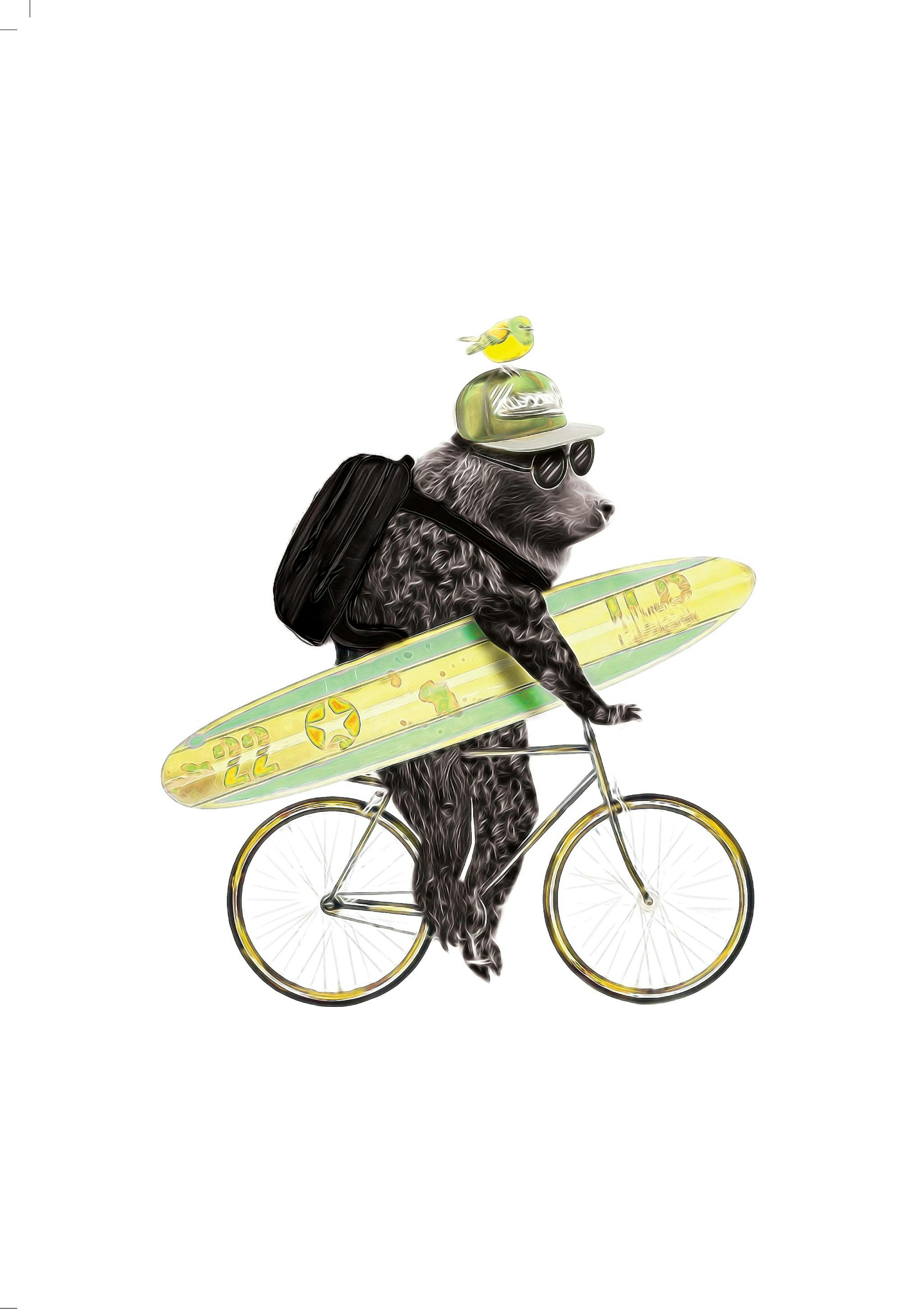 Een leuke print met een beer voor zowel kinderen als volwassenen. Illustratie met een beer op een fiets met surfplank.