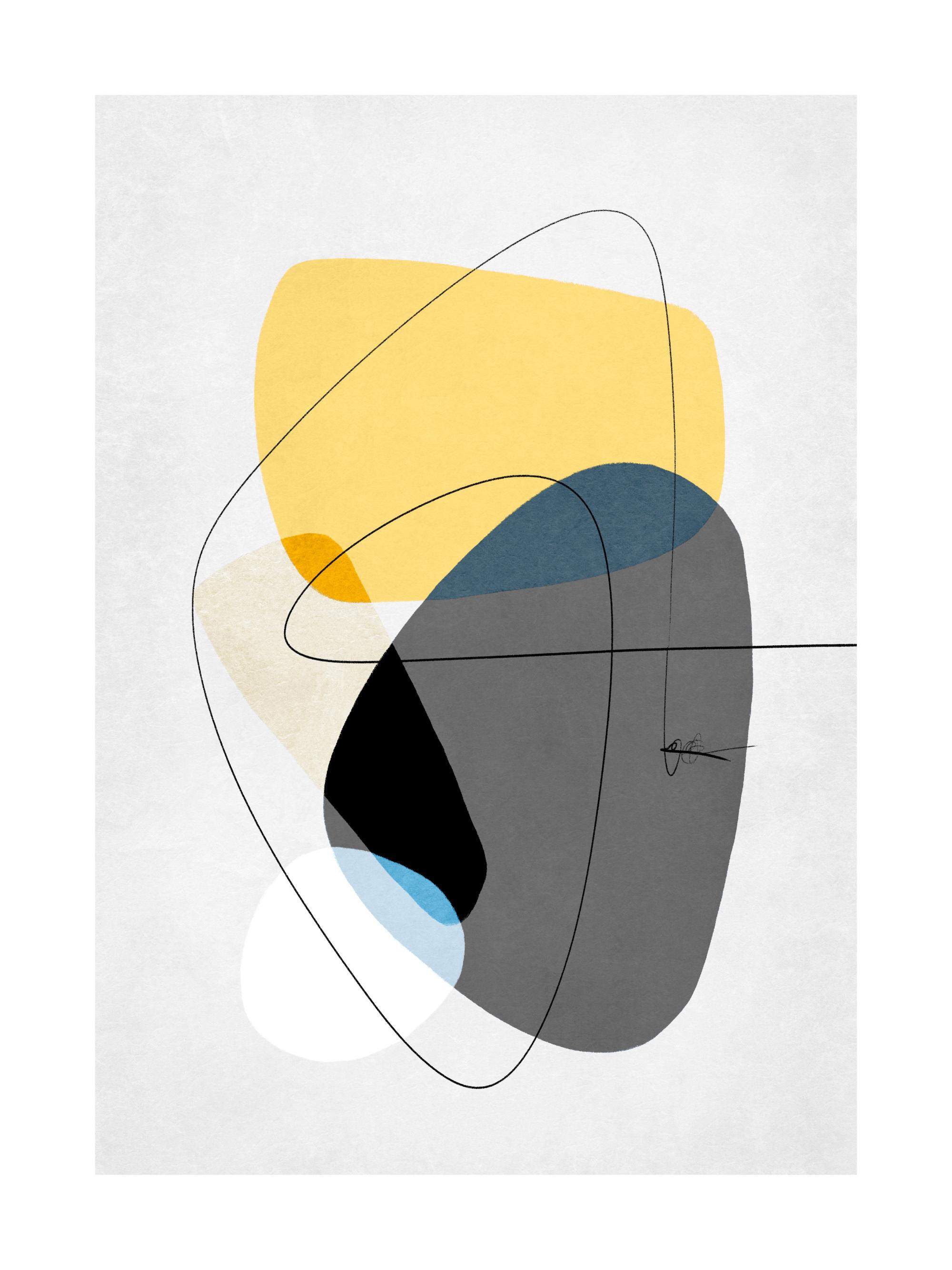 Grafische illustratie met grijze en gele vormen en een zwarte werveling op een lichtgrijze achtergrond. Abstracte kunst is een stijl die nooit verveelt, en met de poster Contemporary Yellow No1 heb je een perfect paar.