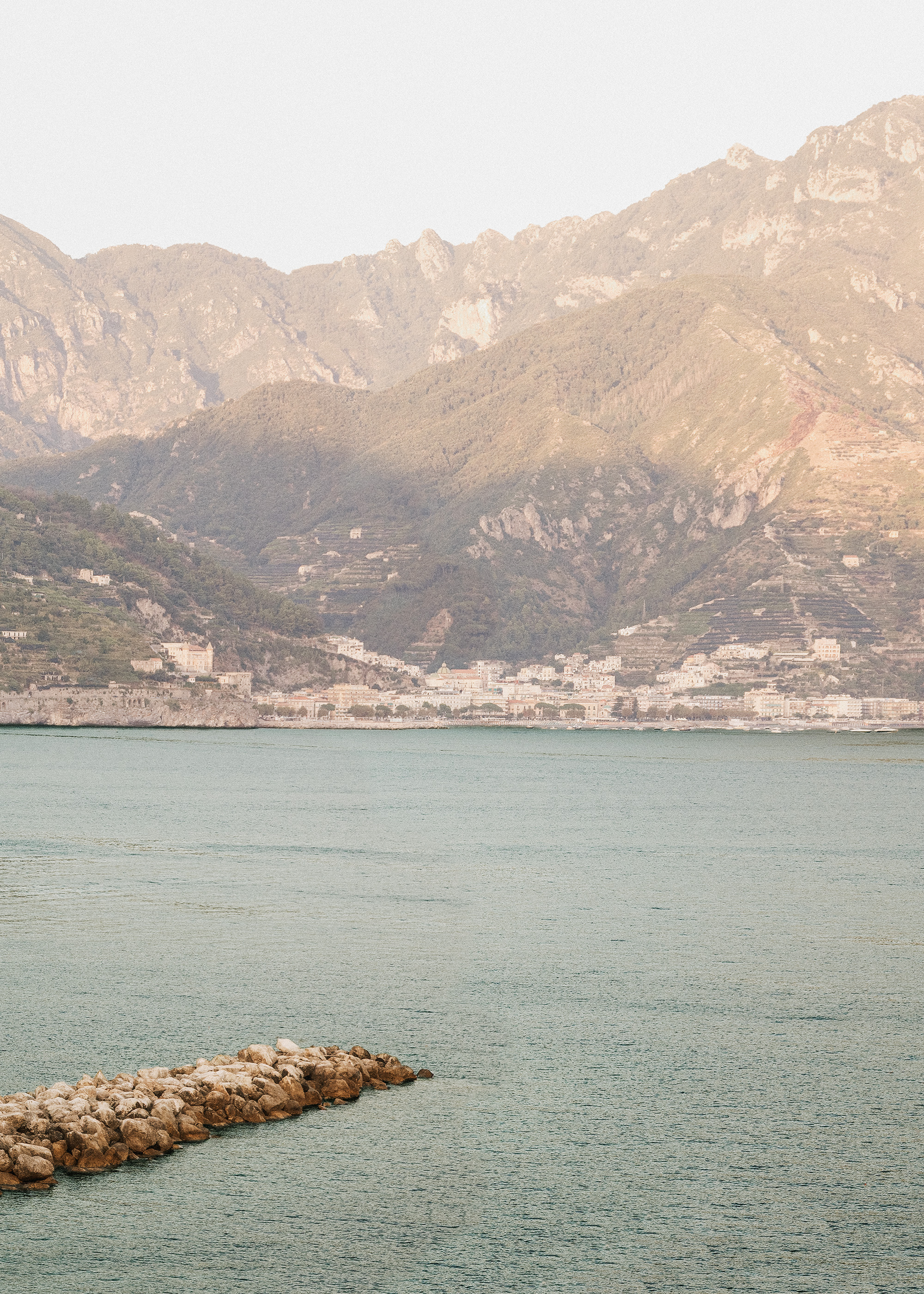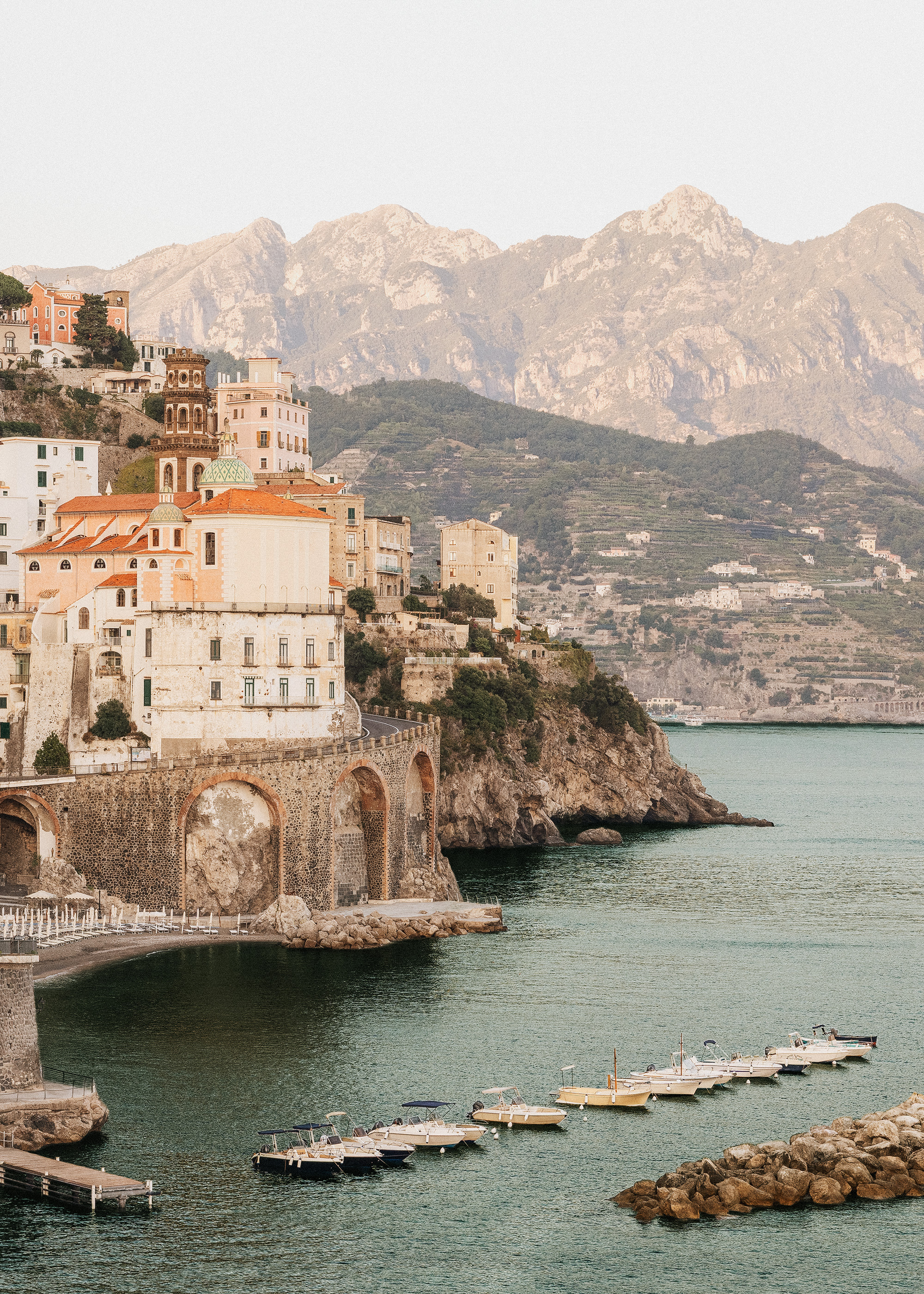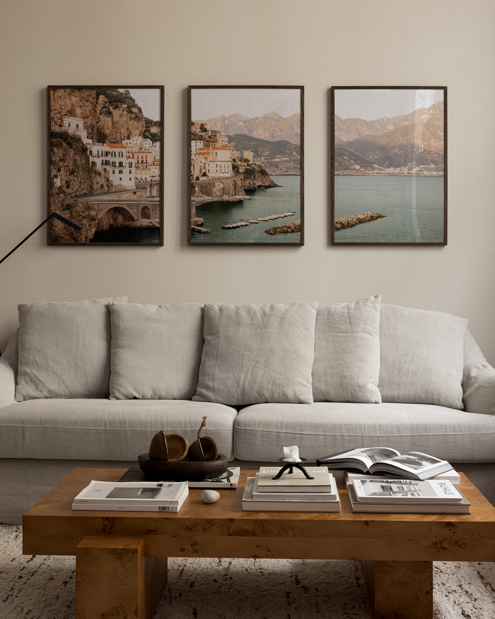 Prachtige posters van Amalfi, met kleurrijke gebouwen op kliffen aan zee, omringd door boten en bergen op de achtergrond.