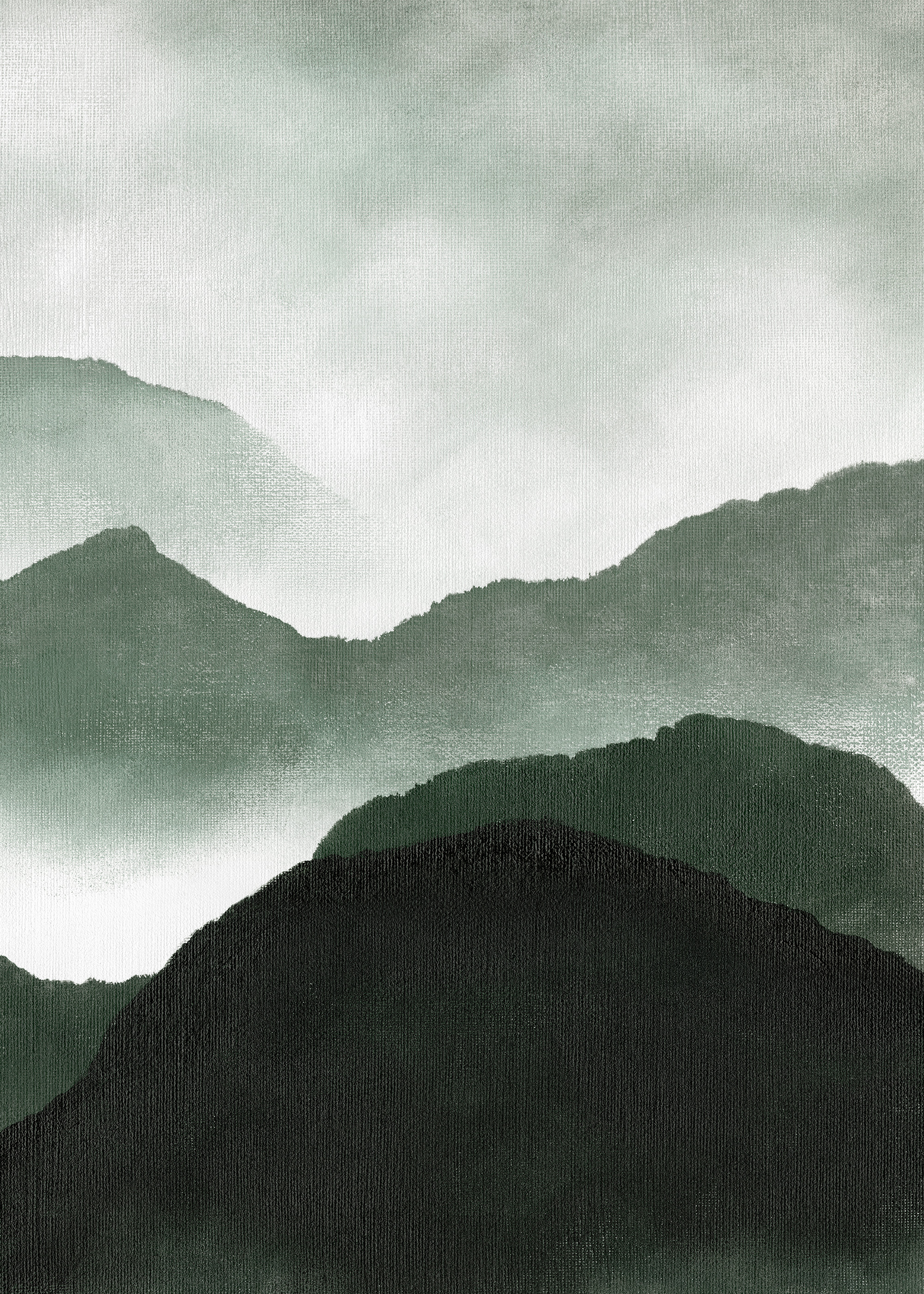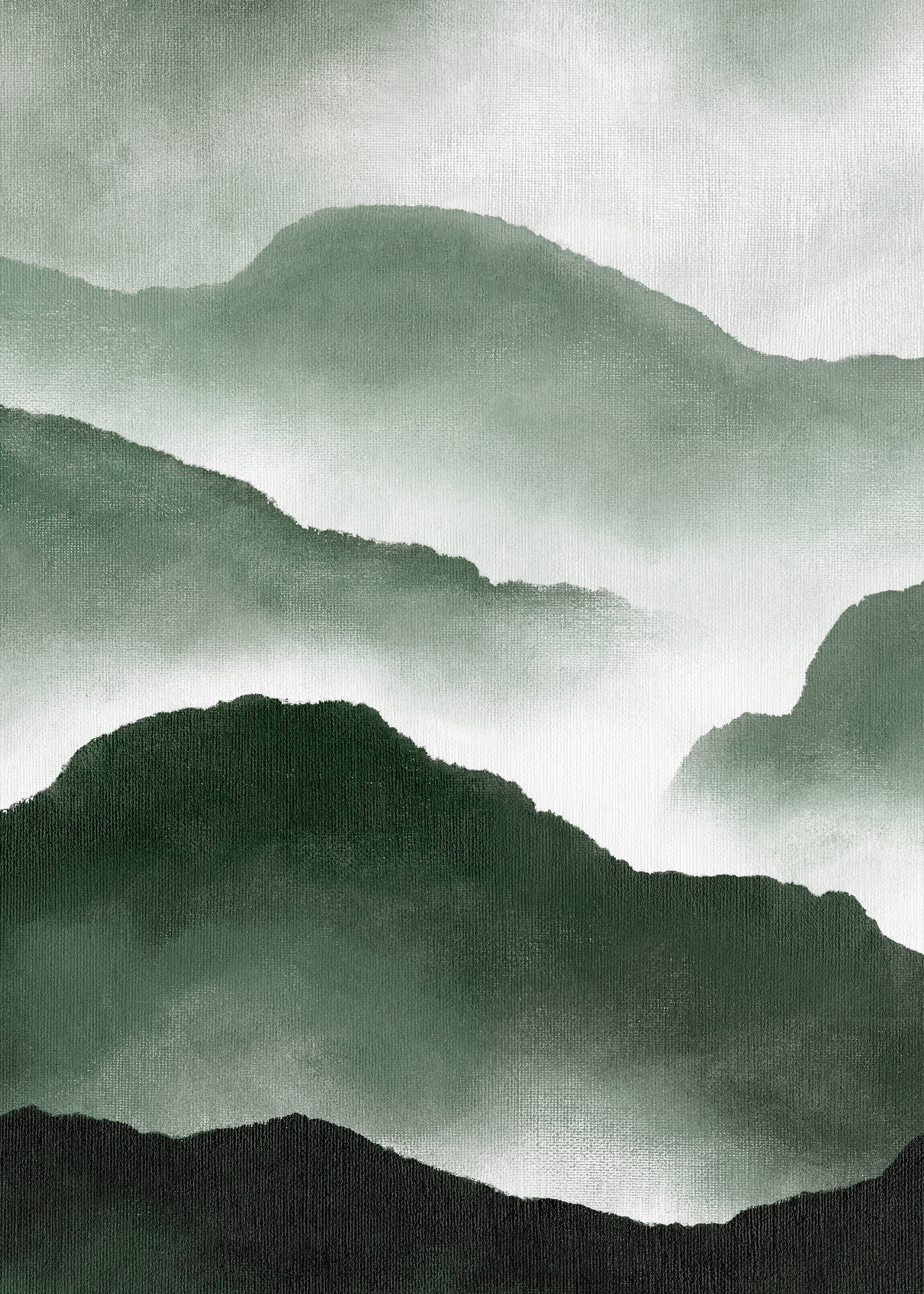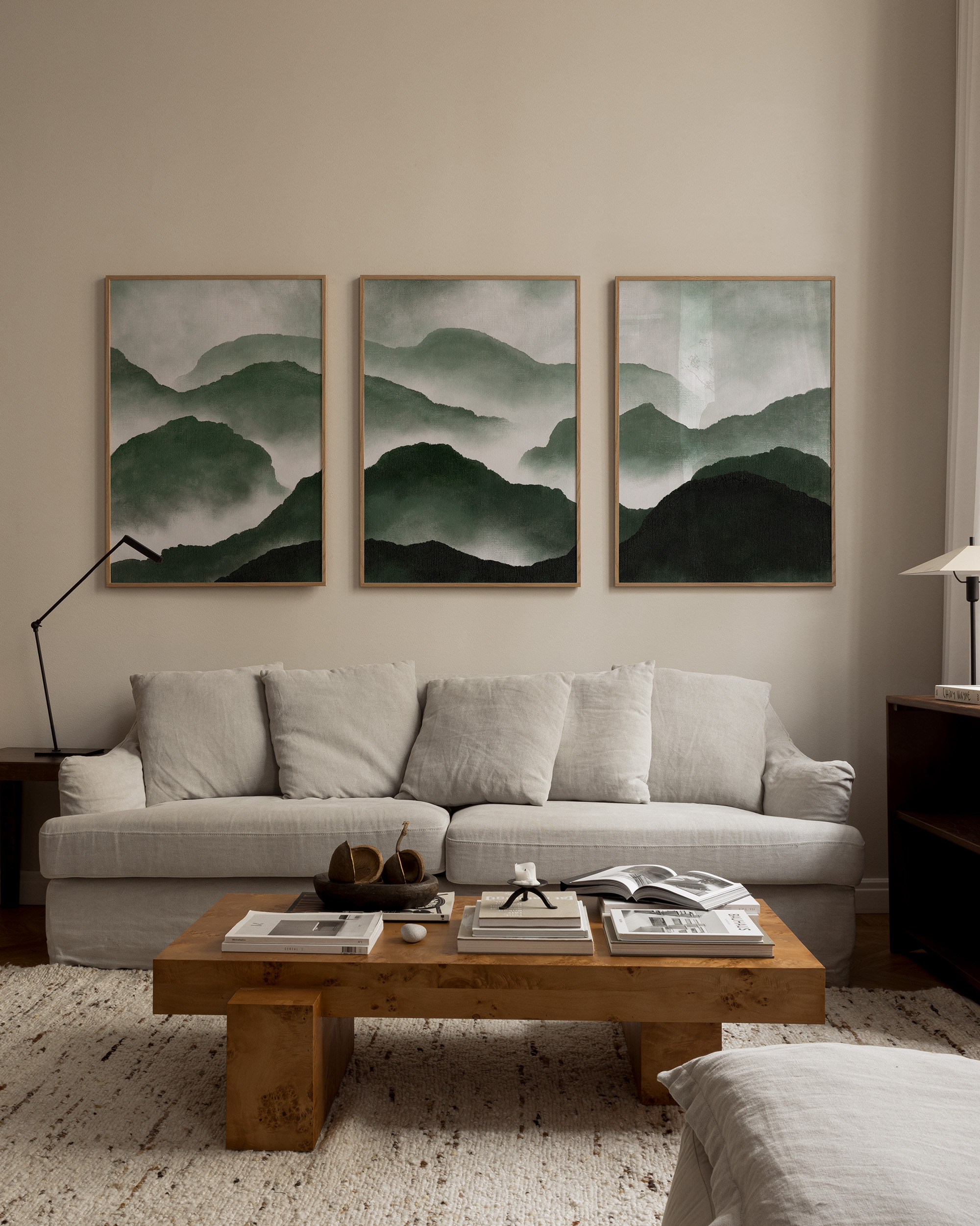 Posters met mistige groene en donkergrijze bergen, verdeeld over drie panelen. Perfecte wanddecoratie om een rustige sfeer in jouw huis te creëren.