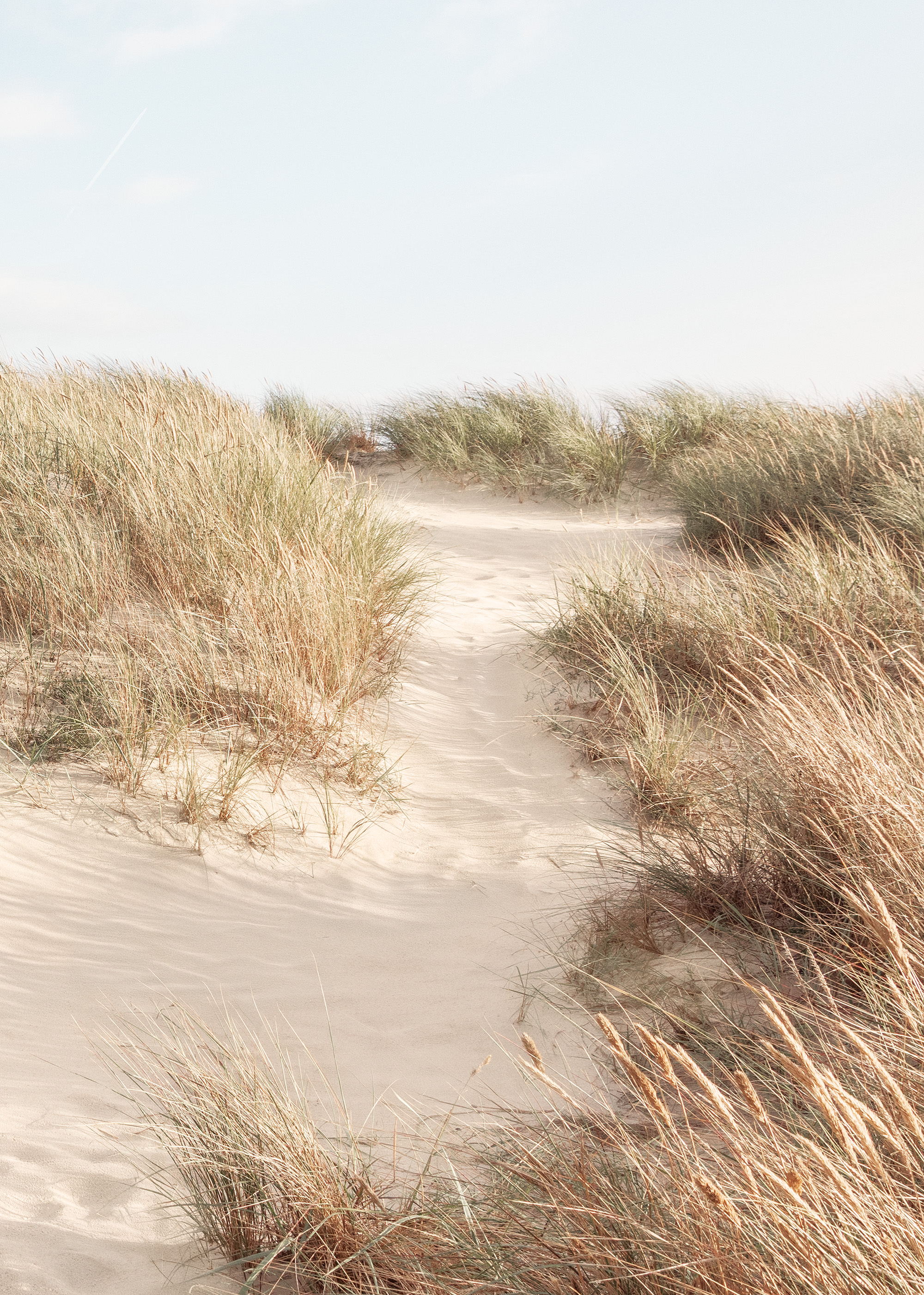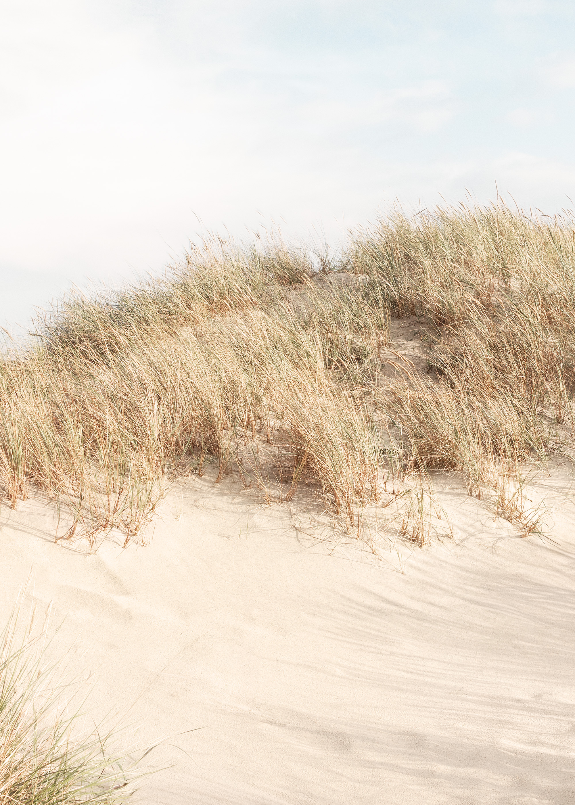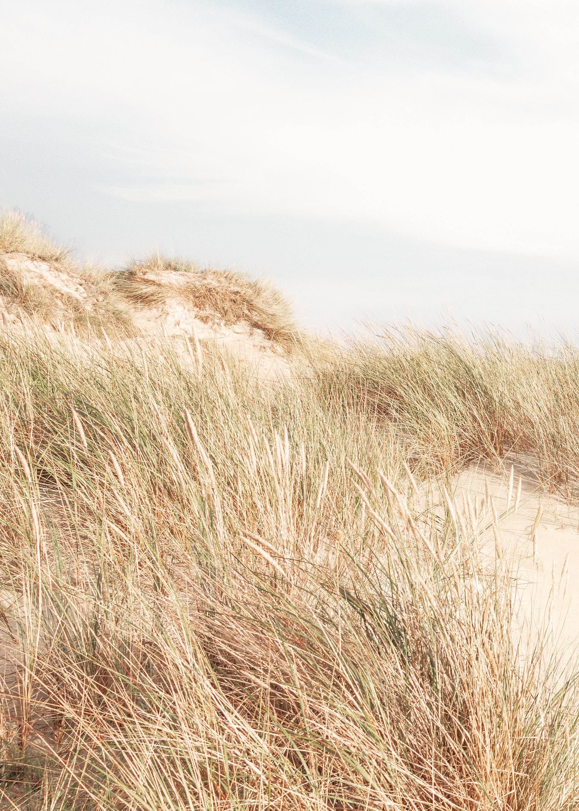 Een prachtige set posters van zandduinen met hoog gras, in groene en beige tinten, tegen een heldere hemel.