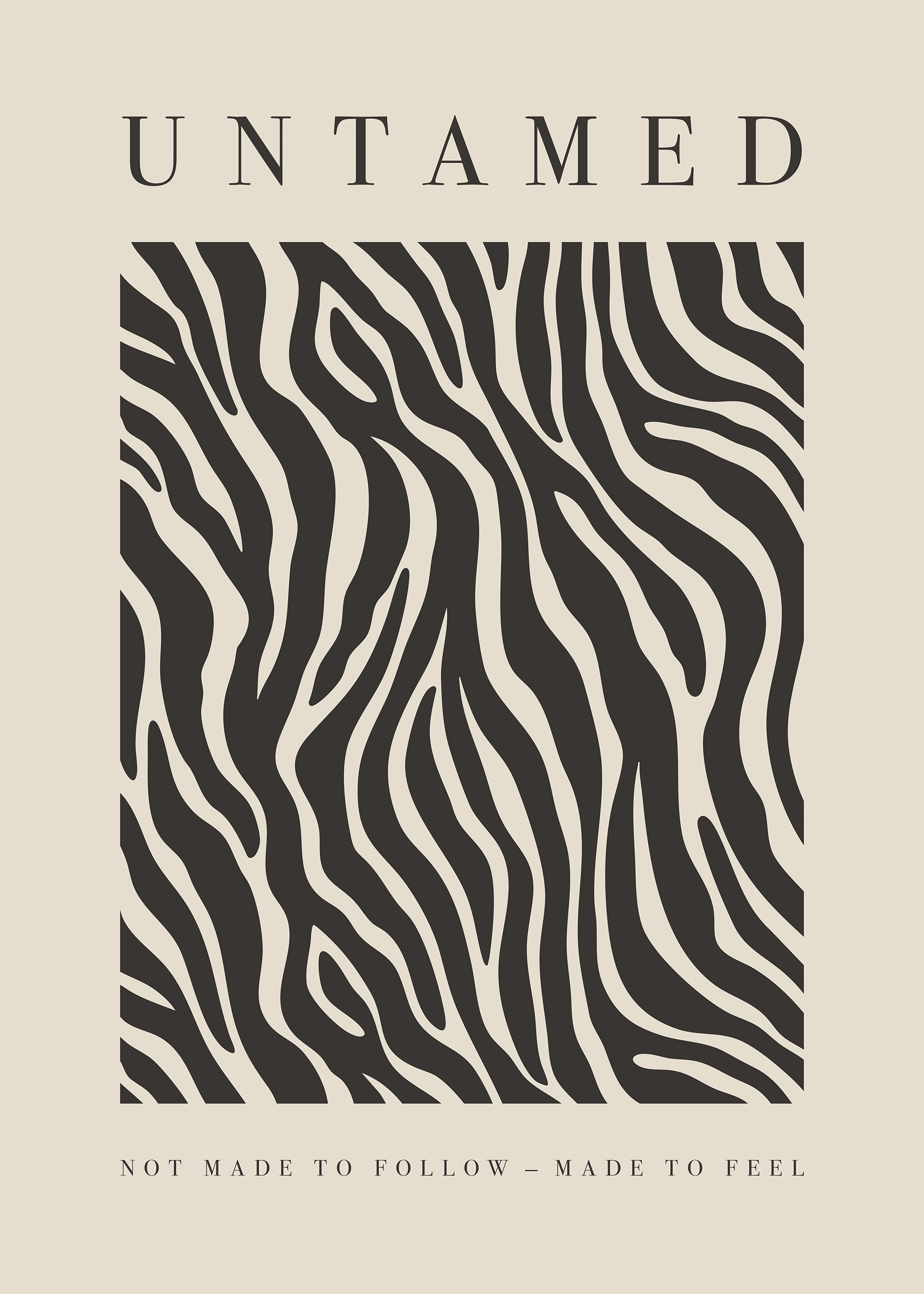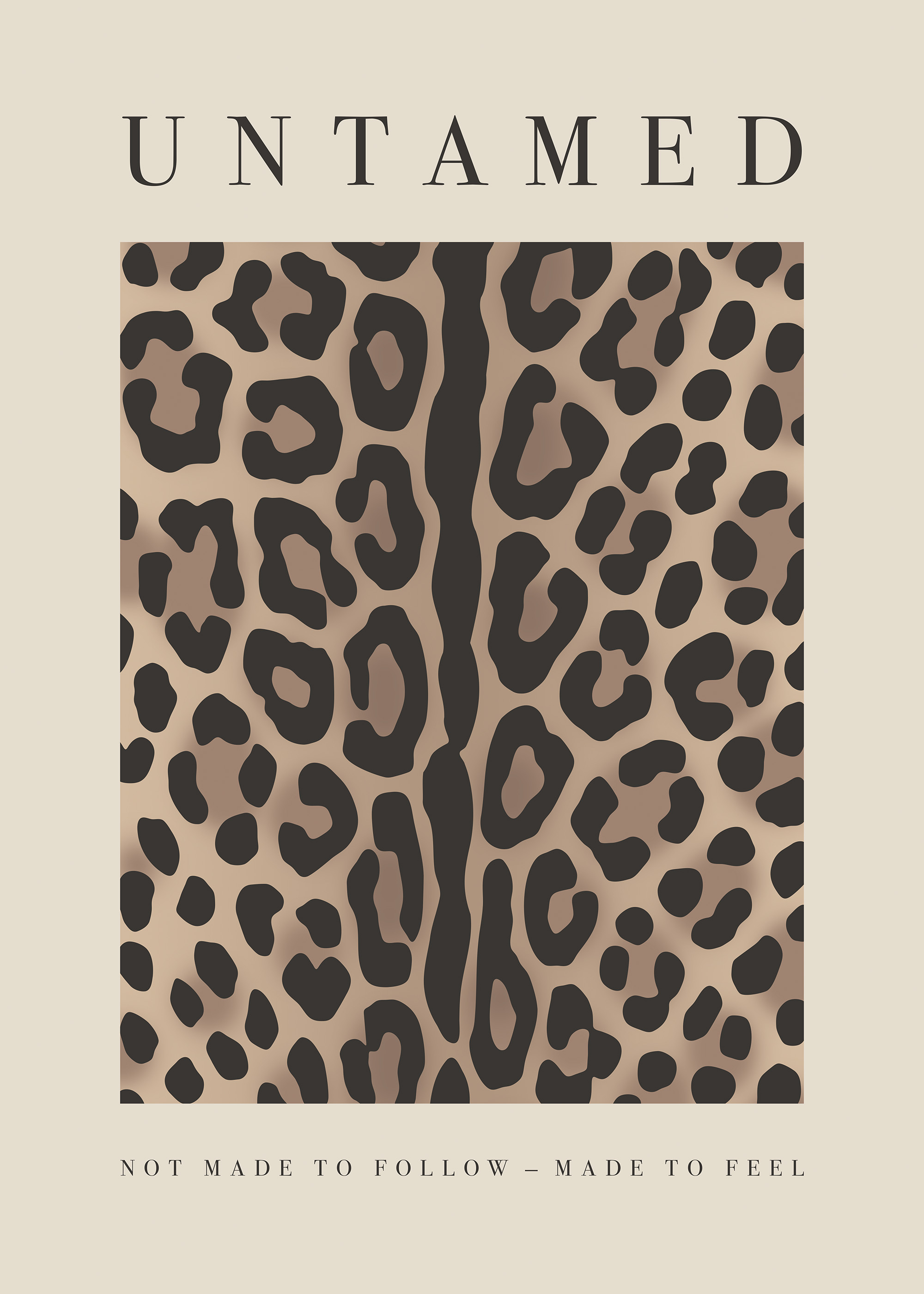 Twee posters met dierenpatronen: zwarte-witte zebrastrepen en een bruin-zwart luipaardprint. Beide posters zijn voorzien van de tekst "UNTAMED".