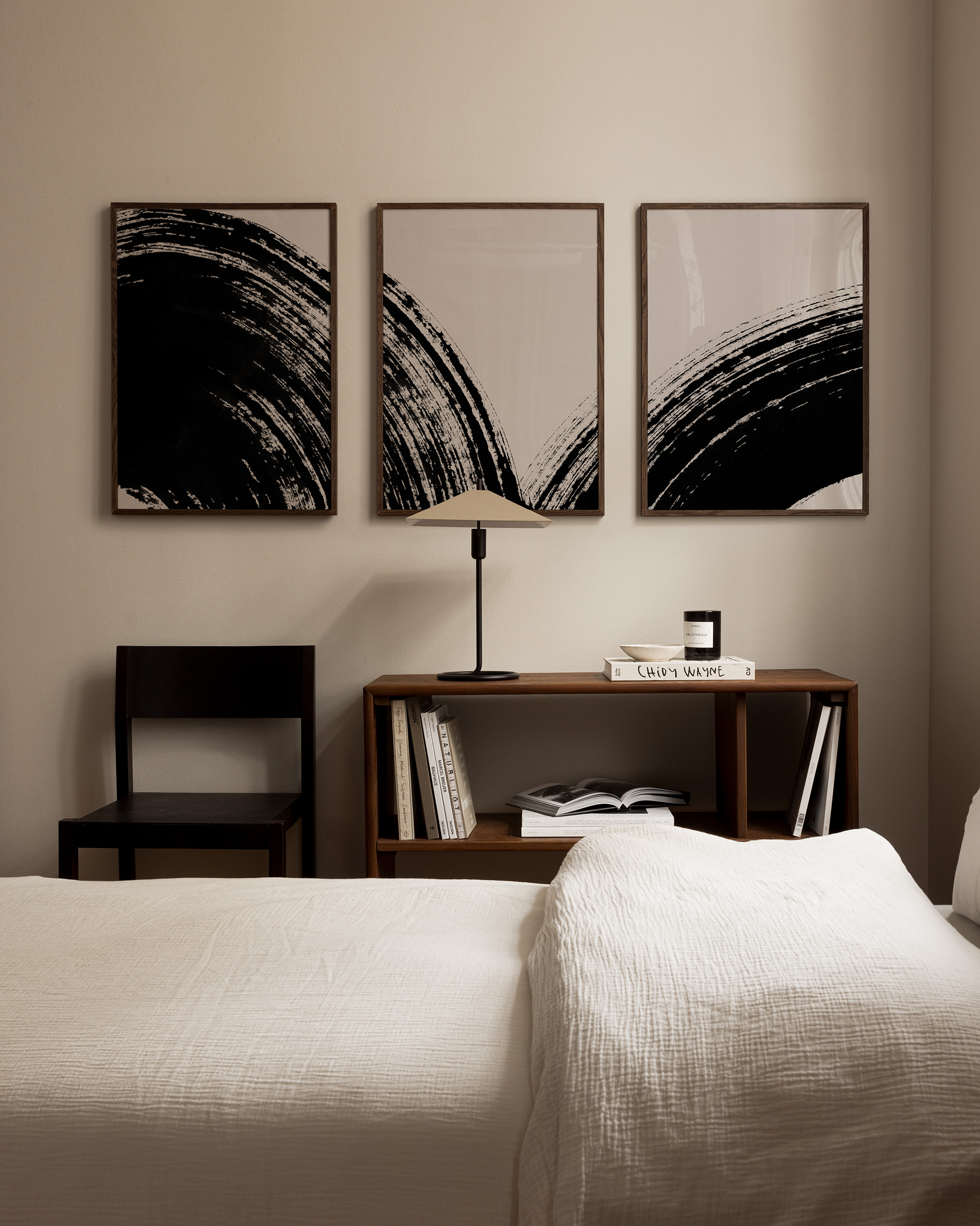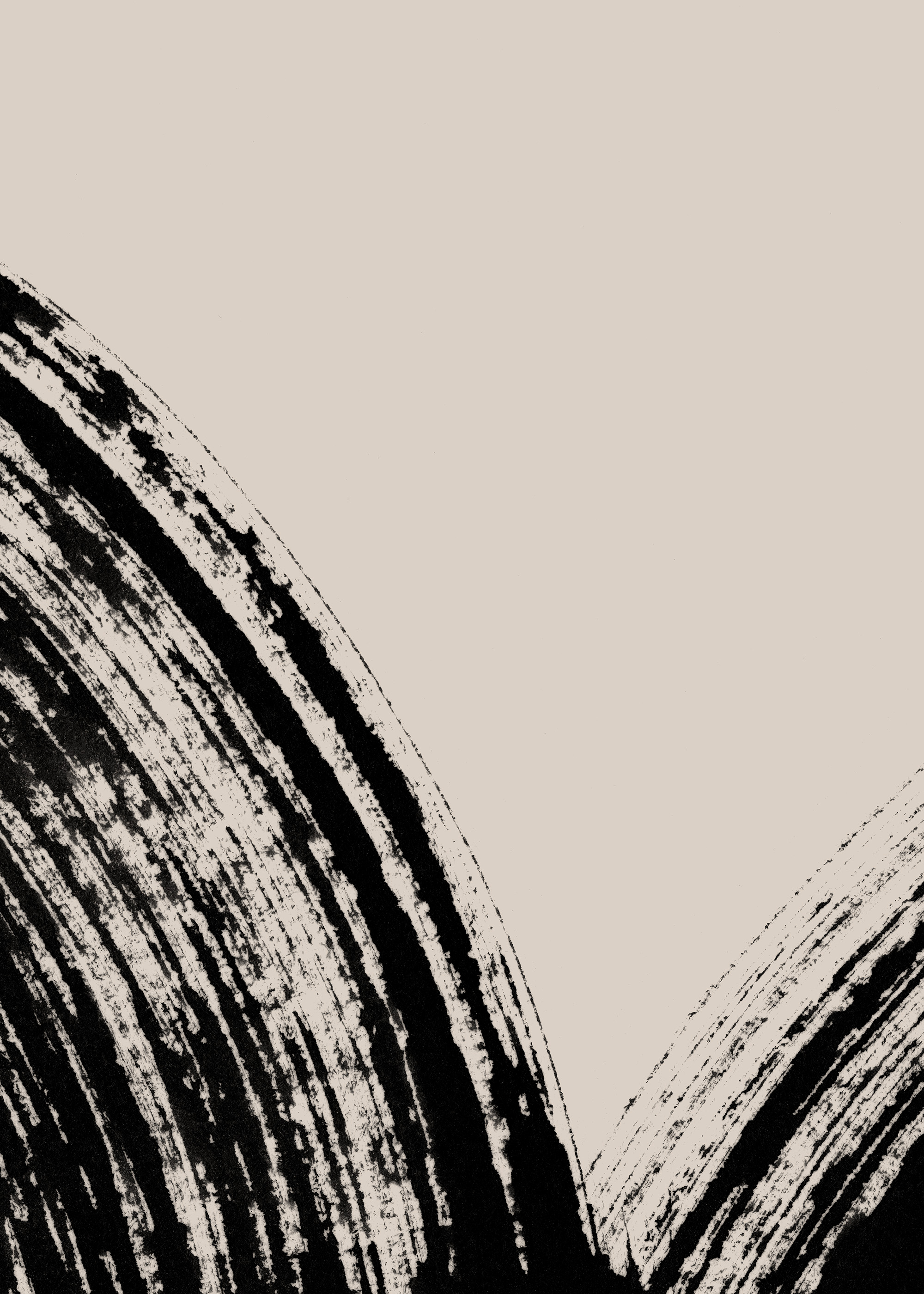 Abstracte posters met gedurfde zwarte penseelstreken op beige achtergronden. De dikke streken hebben ruwe randen en vormen gebogen patronen over de posters.